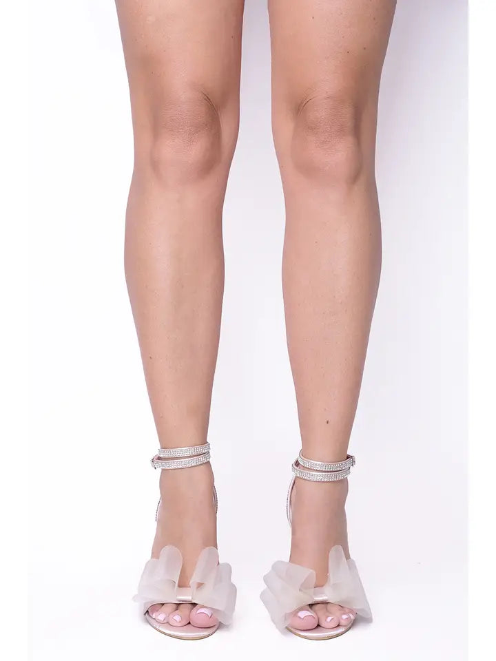 Champagne High Heel Sandals Mesh Bow Diamante Ankle Tie