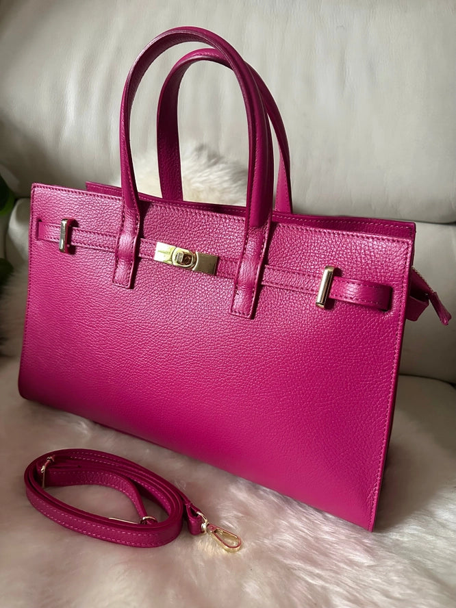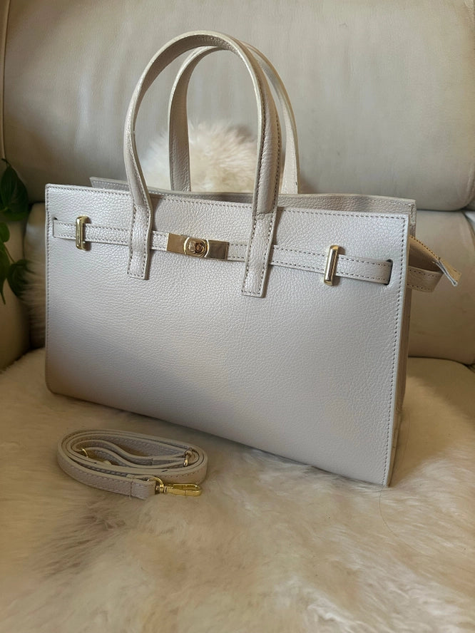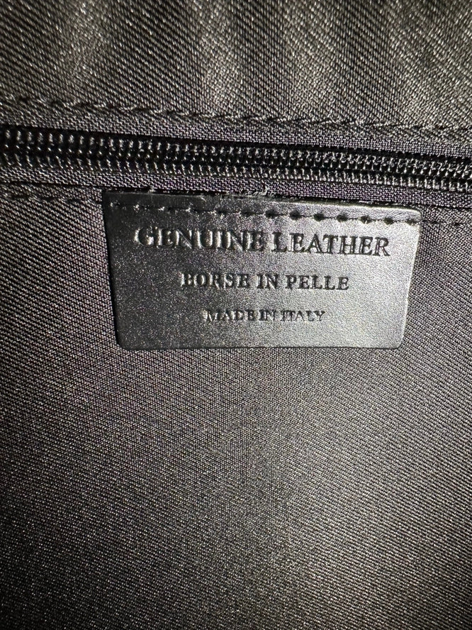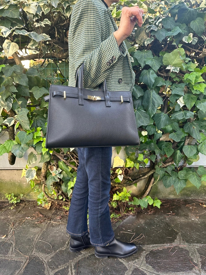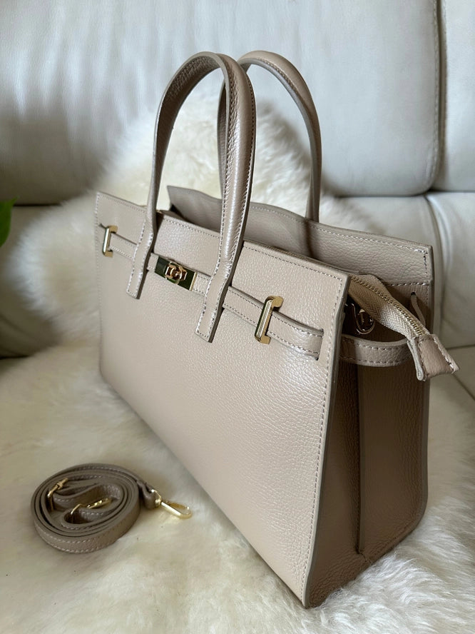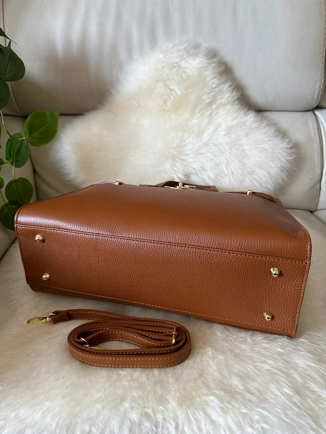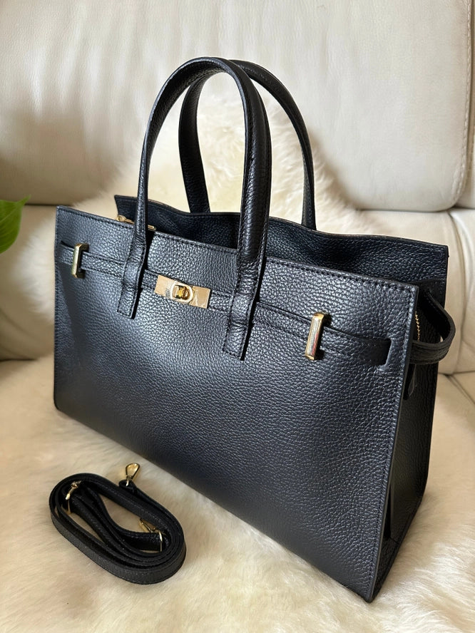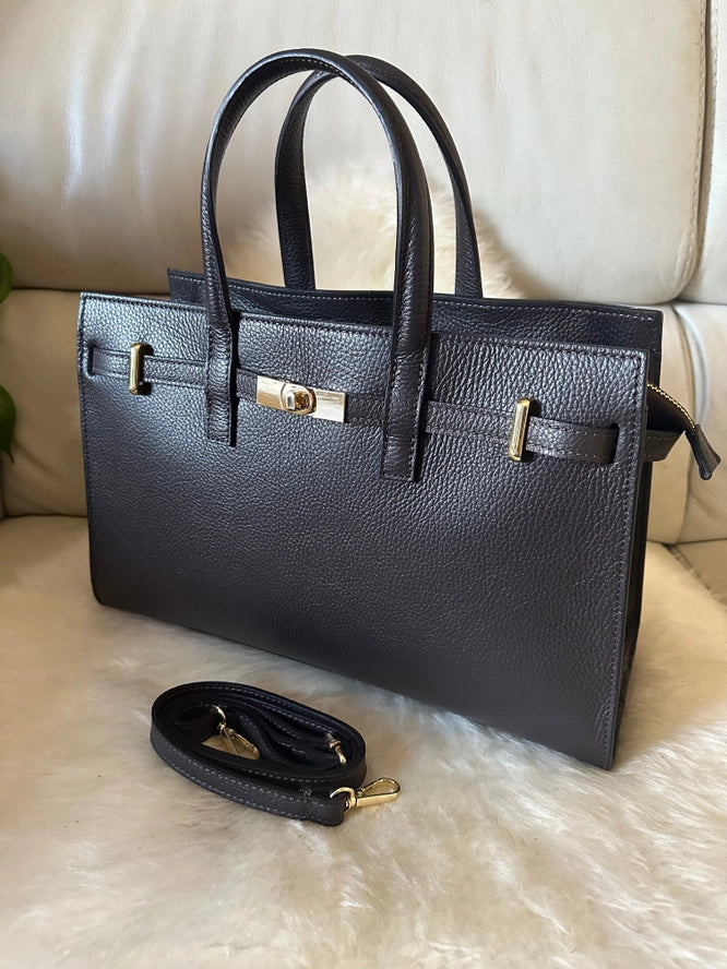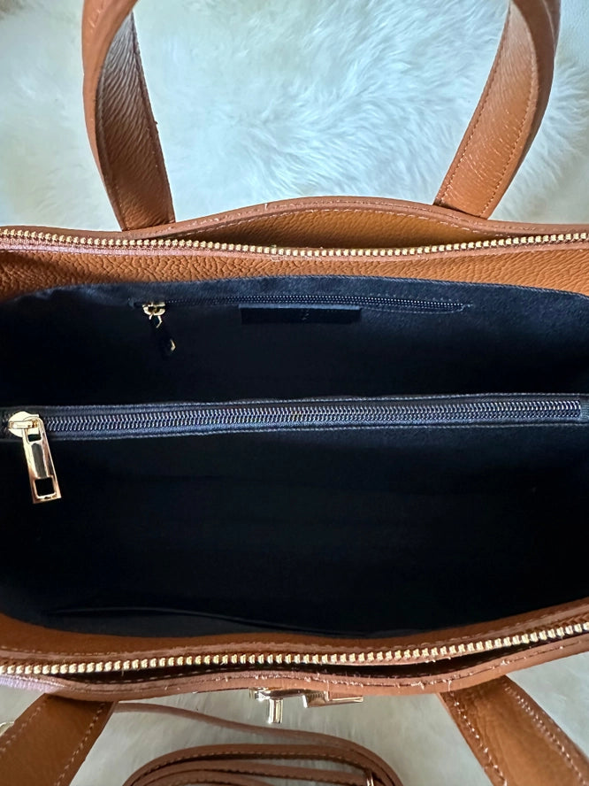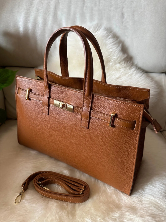 Crafted in Italy from genuine hammered leather, this versatile tote offers an adjustable shoulder strap for hand, crossbody, or shoulder wear. Its elegant, classic design combines comfort and spaciousness, perfect for professional use or casual afternoons. The interior features a lined division with two compartments and a large zippered central pocket, ensuring organized storage. Finished with gold hardware, this bag measures 24 cm in height, 38 cm at the base, with a 15.5 cm handle drop, balancing style with practicality for daily use.