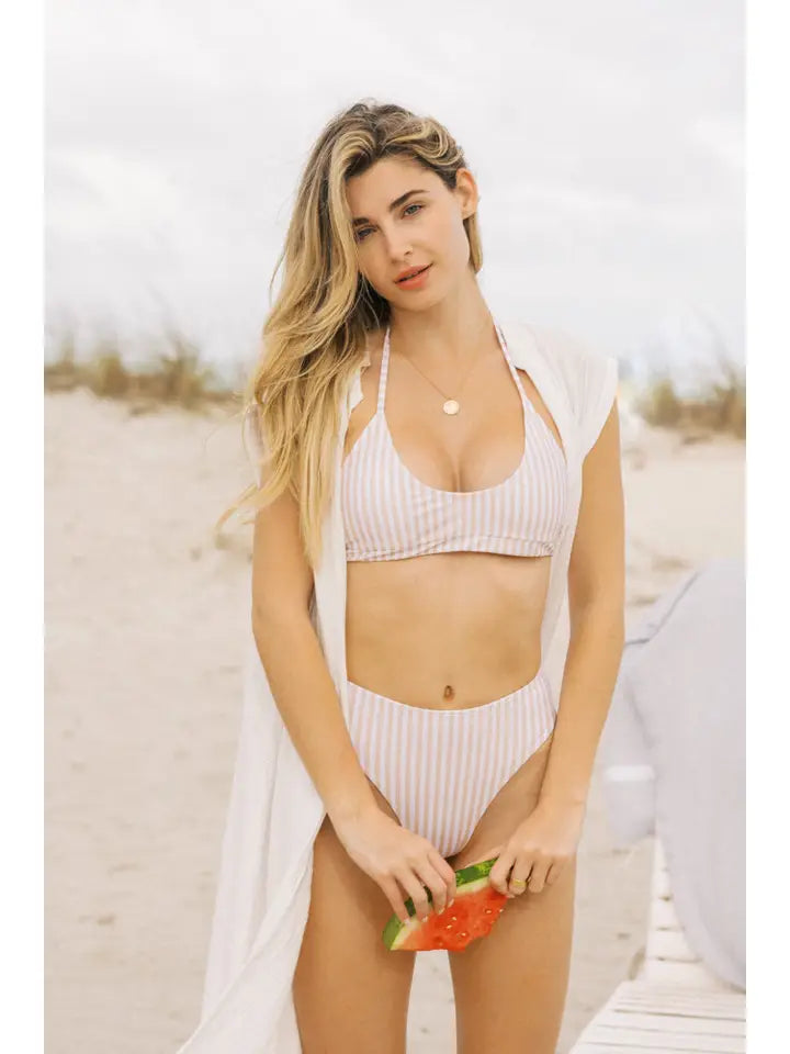 The Halo Top - Nude Stripe offers a refined twist on the classic bikini with a halter neckline designed to flatter and support larger busts. Crafted from buttery soft, recycled Italian fabric, it features adjustable straps at the neck and under the bust for customized lift and comfort. The double-lined construction includes removable padding for versatility, while its subtle white and nude stripe pattern provides timeless elegance. Ideal for those seeking both style and expert support in swimwear.