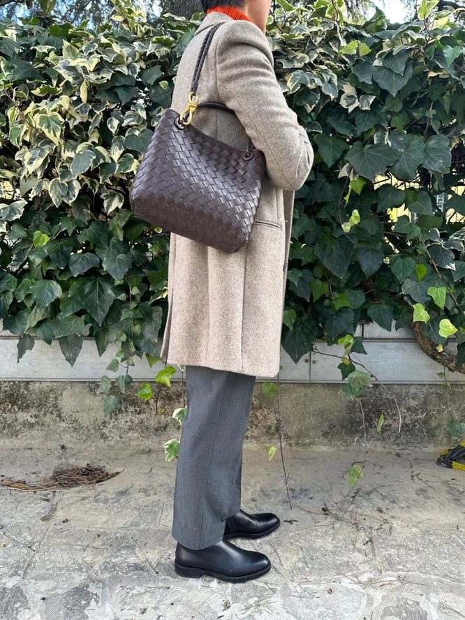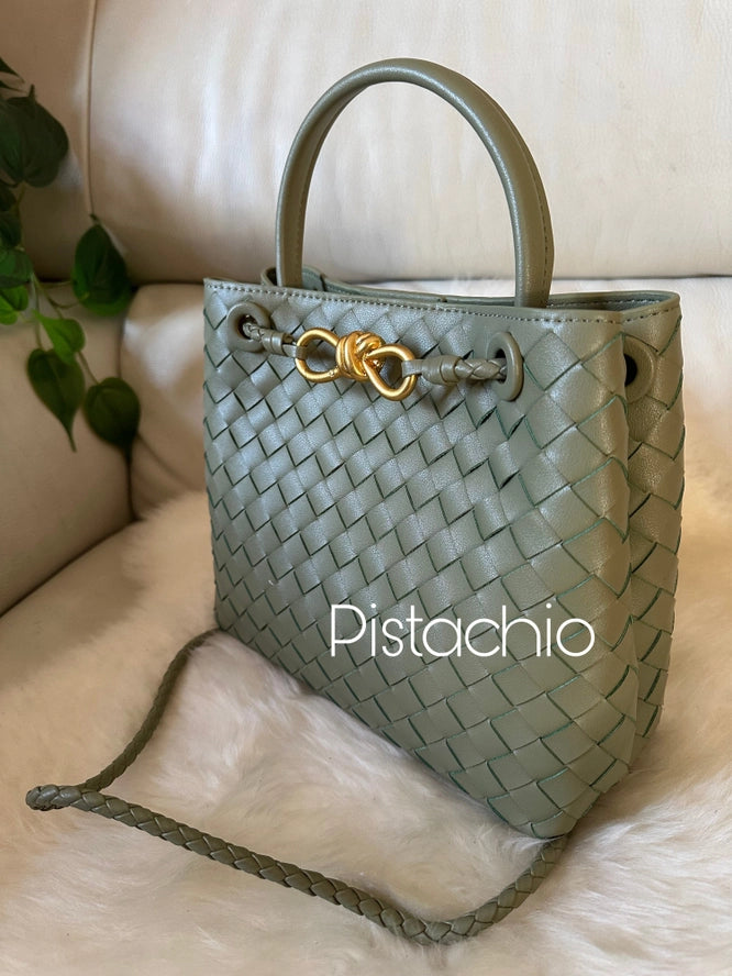 Crafted from genuine woven leather, the Isa bag offers versatile elegance for any occasion. Designed for comfort, it can be worn on the shoulder, crossbody, or carried by hand. Its medium size balances practicality with style, featuring a secure magnetic closure and a single compartment with a zippered pocket to organize essentials. Dimensions of 22 cm height, 24–25 cm length, and 9.5 cm base thickness make it ideal for daily use or sophisticated evening looks. Notably, the burgundy and pistachio versions reveal subtle pink and green leather accents along the weave edges for a unique touch.