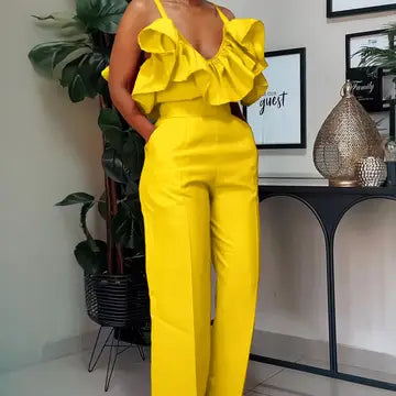 Elevate your wardrobe with this Stylish V-Neck Ruffled Halter Top paired with High-Waisted Pantsuit, crafted from 100% polyester for lasting comfort and durability. Featuring a flattering v-neckline and delicate ruffle detailing, the halter top enhances your silhouette with elegance. The high-waisted pants elongate the legs while ensuring a comfortable fit, making this ensemble suitable for both casual and formal occasions. Offered in vibrant shades of red, white, blue, and yellow, this versatile pantsuit is an essential addition for discerning fashion collections.