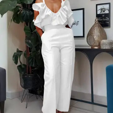 Stylish V-Neck Ruffled Halter Top High-Waisted Pantsuit Fun