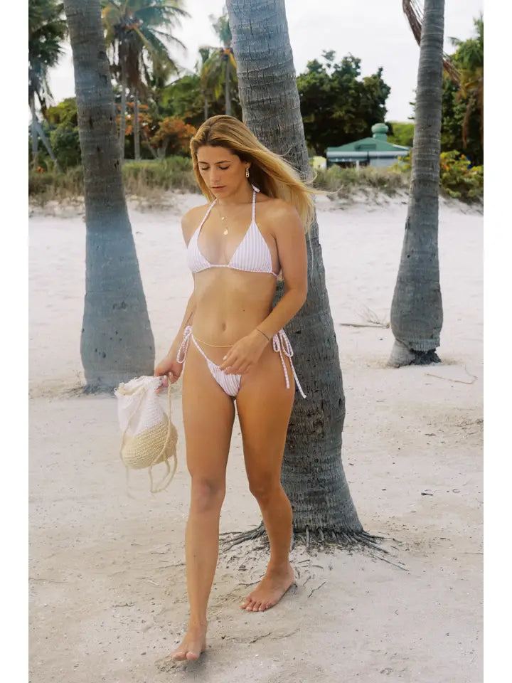 Thea Top - Nude Stripe offers timeless appeal with its classic string bikini design and adjustable cups for a personalized fit. Crafted from buttery soft, recycled Italian fabric, this double-lined top features removable padding and a versatile silhouette that can be styled in over five ways, including a halter. The elegant white and nude striped pattern adds understated sophistication to any swim collection. Perfect for those seeking sustainable style without compromising on comfort or functionality.
